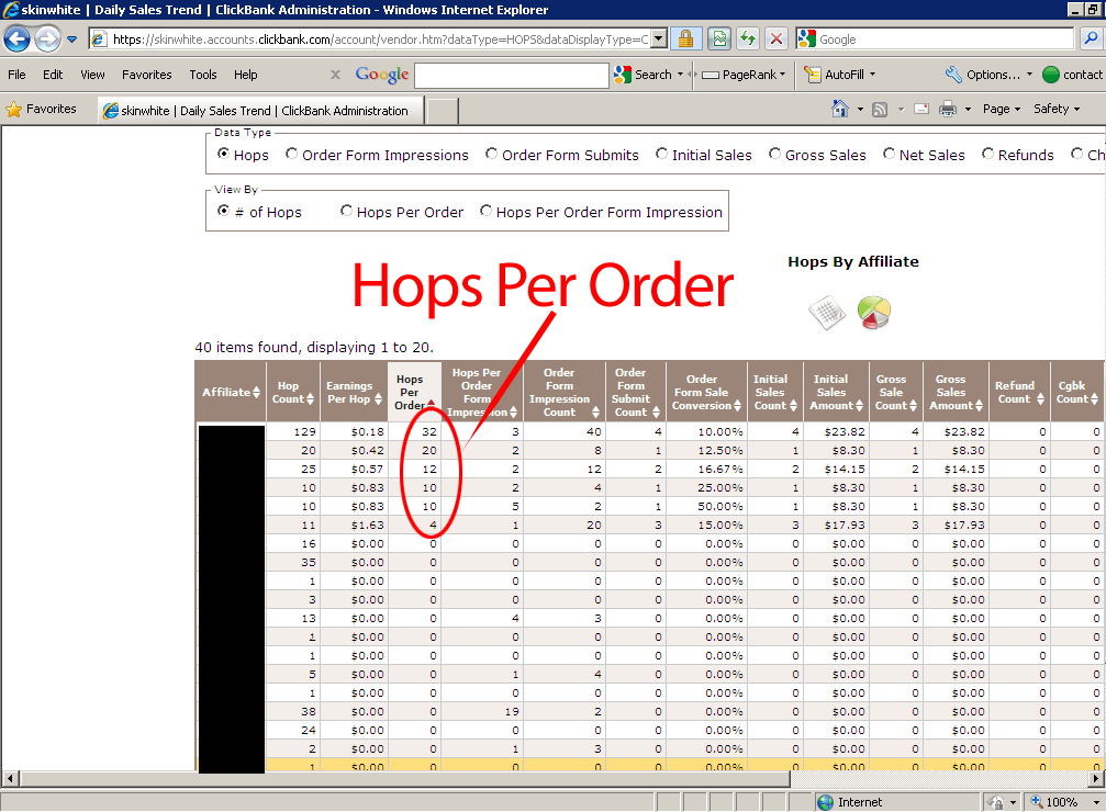 Unique Niche With Conversions of 1 Sale Every 15 Hops Below you can find a screenshot of our ClickBank statistics showing our Average "Hops Per Order" which is as good as 1: 15 - which means that the average Affiliate's conversion is of 1 Sale Every 15 hops! (Screenshot taken just a few days after our official launch) Note: Some data have been blurred to protect the privacy of the entities in question. Free Affiliate Coaching & Guide Shows You Everything You Need To Make Sales...